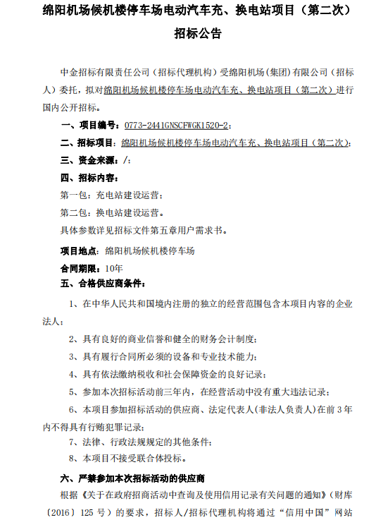 綿陽機(jī)場候機(jī)樓停車場電動汽車充、換電站項目(第二次)招標(biāo)公告