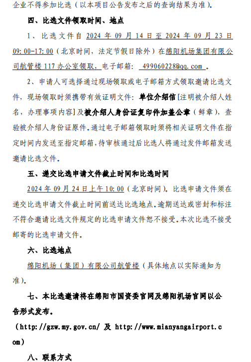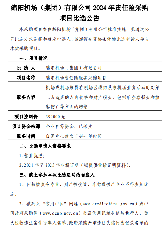 綿陽機場(集團)有限公司2024年責任險采購項目比選公告
