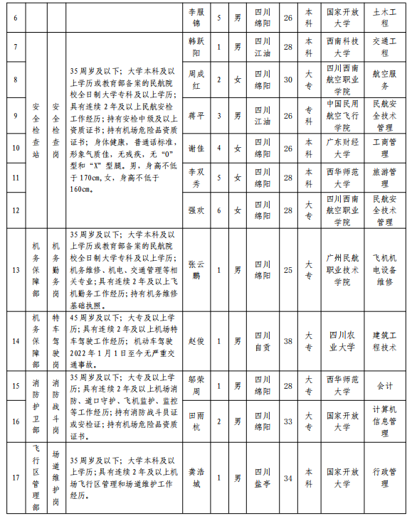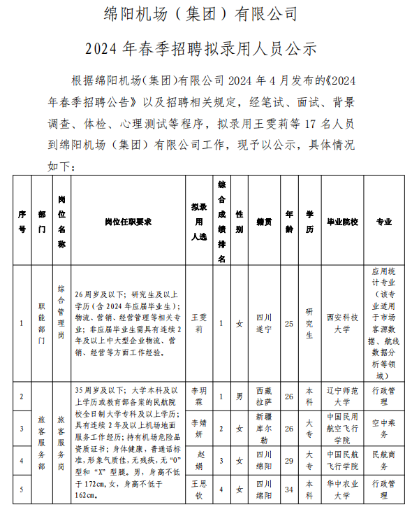 綿陽機(jī)場(集團(tuán))有限公司 2024年春季招聘擬錄用人員公示